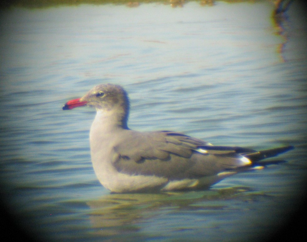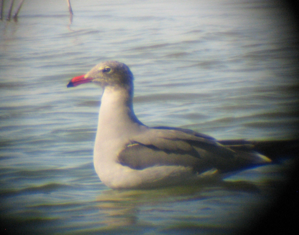 notorious for being one-day wonders. This beautiful species is unmistakable. It is either a 3rd year or adult in nonbreeding plumage. Diagnostic features include the dark gray mantle and wings, ligher gray head, neck and breast, bright red bill with a black tip.