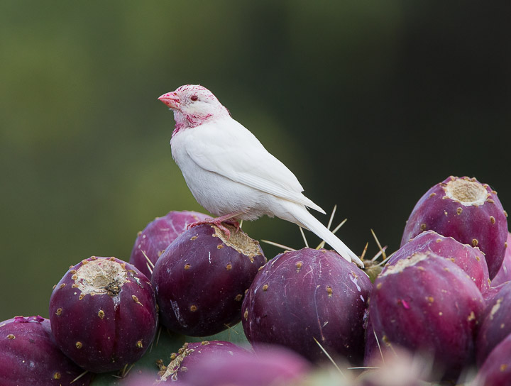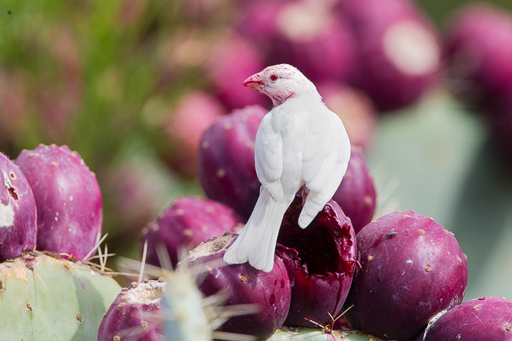 Albino House Finch (Haemorhous mexicanus), Hereford, Cochise CountyThis albino bird, probably a House Finch, was photographed by Tom Deecken on 23 July 2015 Albinism is very rarely reported in wild birds.